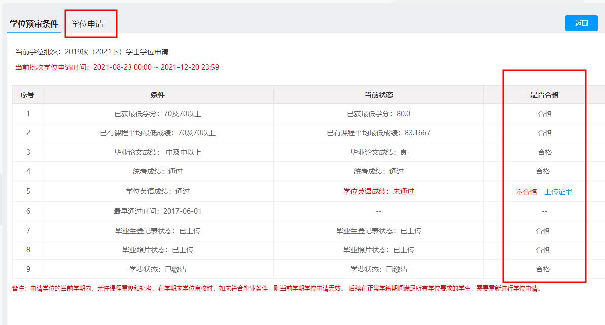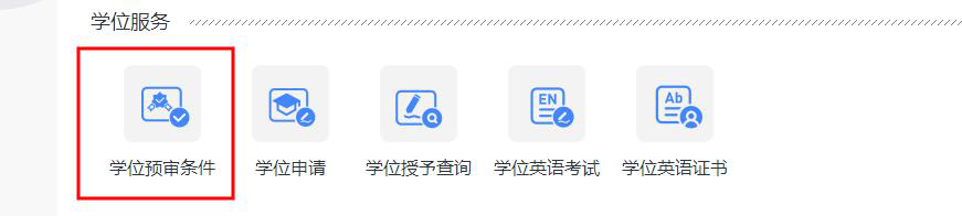特别说明:学生可在“学历服务”-“学位服务”中的“学位预审条件”中查看自己的各项要求(如下图),须全部条件都合格,方可在线提交学位申请,学院将根据学生的申请时间来统一安排论文答辩。在线提交学位申请的时间,请务必在每学期开学时留意学位申请的相关通知,以免错过。