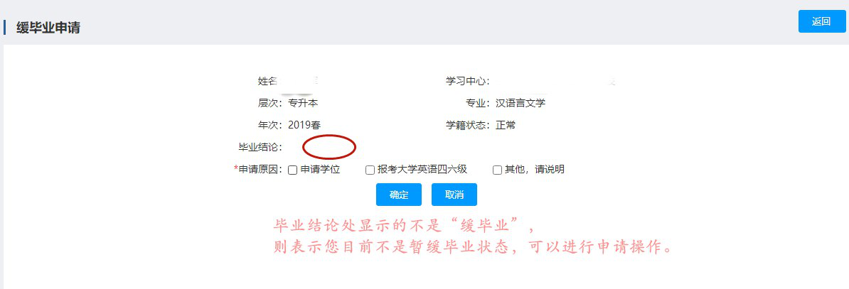 2、 进入“缓毕业申请页面”后,学生可以根据“毕业结论”来判断自己是否处于缓毕业状态,如显示“缓毕业”,则表示正处于暂缓毕业;如果显示“未审核”“不合格”“待完善”,则表示未处于缓毕业。学生可勾选申请原因后单击“确定”,即可完成缓毕业申请。