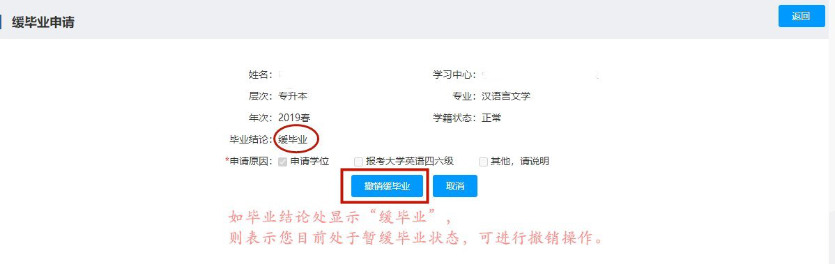 注:在功能开放时间段内,学生可以多次申请或撤销缓毕业,但请务必在操作后再次查看自己的毕业结论显示状态,以确认自己是否处于“缓毕业”,避免发生误操作。