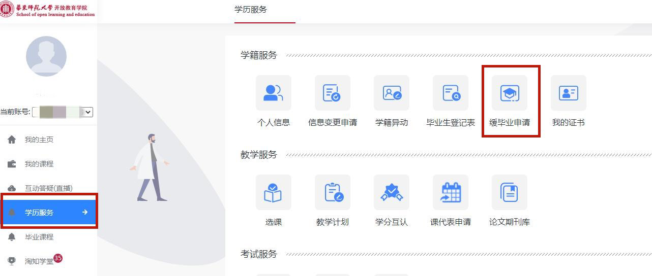 1、 学生通过学号和密码登录学习空间主页。在左侧导航栏中点选“学历服务”,在右侧页面点选学籍服务下的“缓毕业申请”。即可进入暂缓毕业的申请或撤销操作界面。