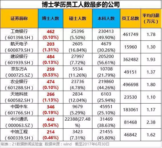 2017中报刚刚披露完毕,21数据新闻实验室通过统计3347家A股上市公司的人员构成和薪酬分布发现,作为人均月薪最高的银行和非银金融行业,其硕士及以上学历员工人数占比也位居TOP3。