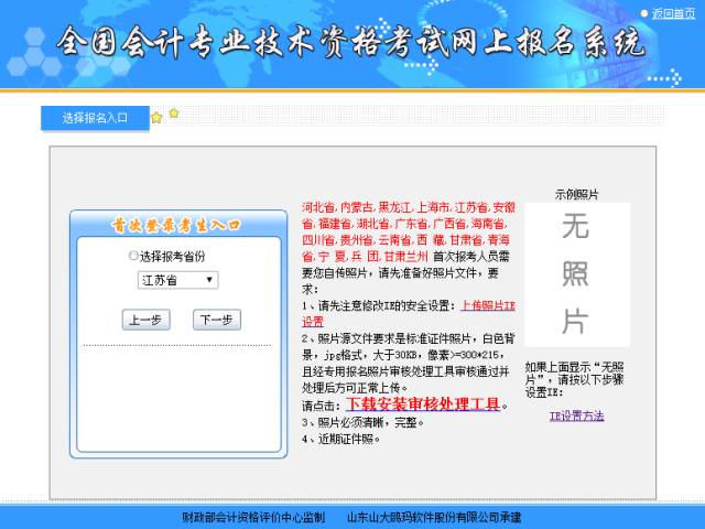 以江苏为例,注意一定要用IE浏览器!(下图红字所示地区首次报考需要自传照片,照片源文件要求是标准证件照片,白色背景,jpg格式,大于30KB,像素>=300*215,且经专用报名照片审核处理工具审核通过并处理后方可正常上传。)
