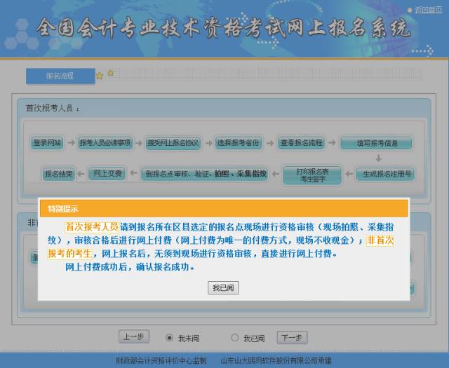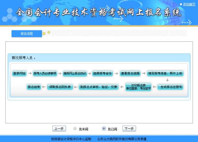 第六步:进入报名流程图,仔细查看后,点击“我已阅”。之后点击“下一步”。